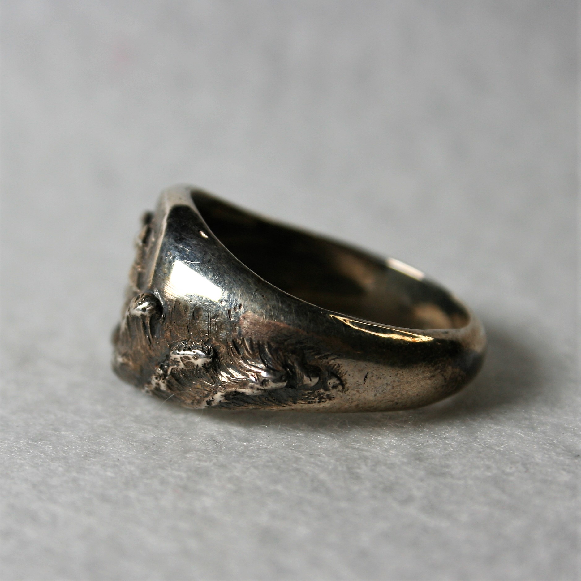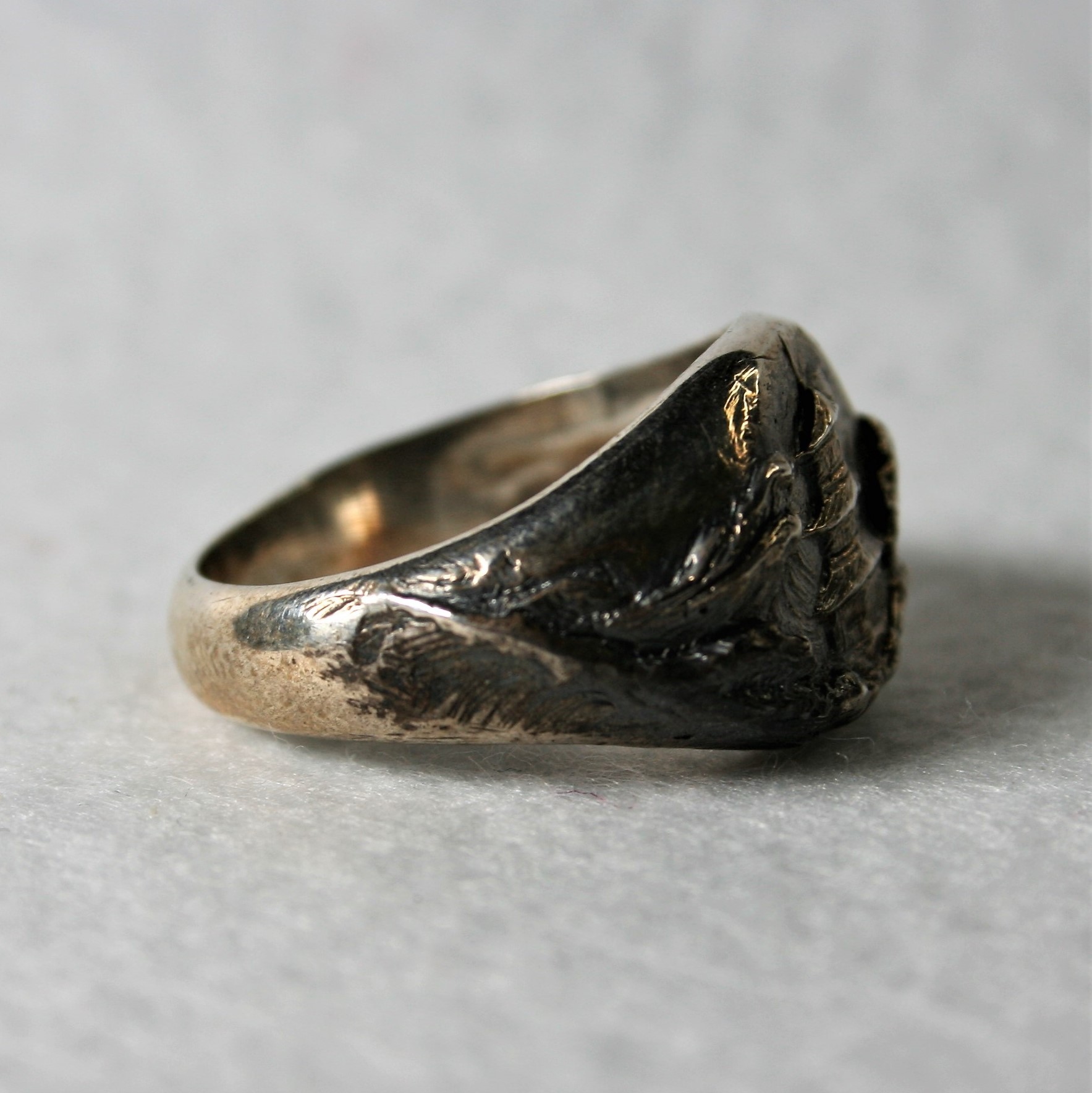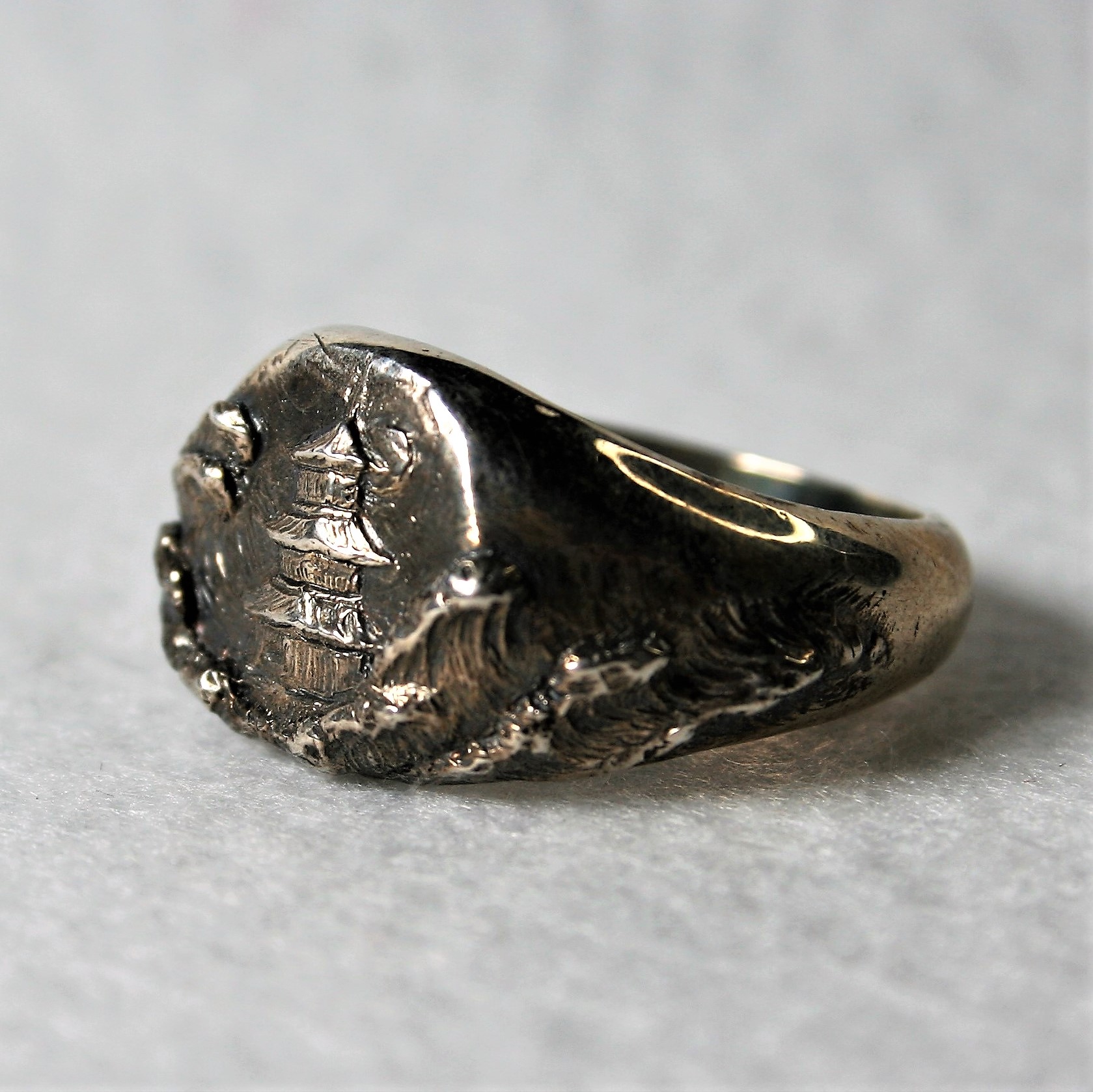 L’anello “Japan” per uomo presenta un soggetto tipicamente giapponese, sapientemente inciso nell’argento