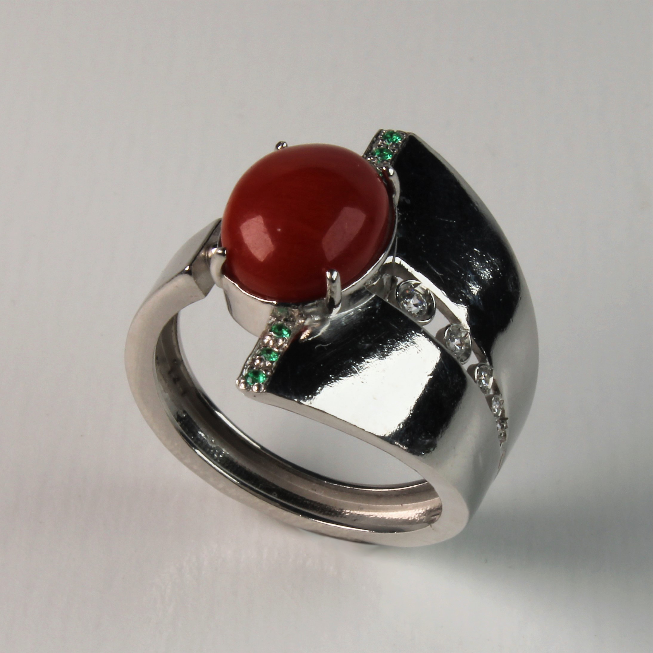 Elegant and modern at the same time. With coral and emeralds on the top and diamonds on the side it will be a special jewel that gives a touch of luxury to your style.