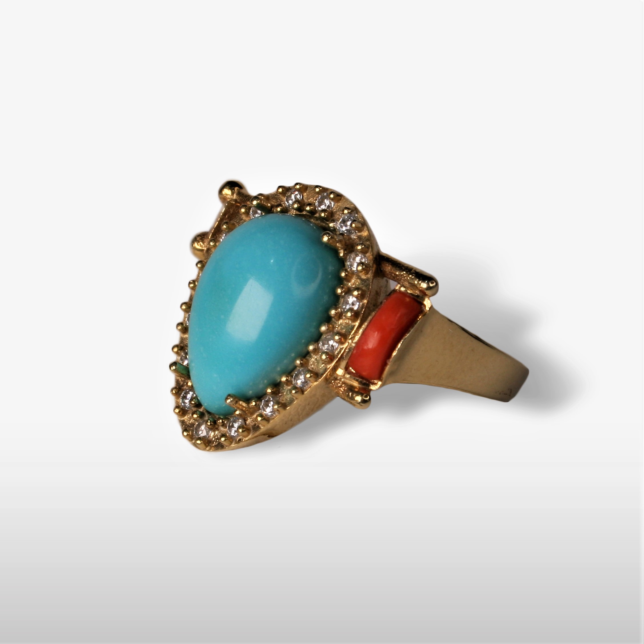 At the center is a beautiful original Arizona turquoise cabochon, set among diamonds and on the side is a Mediterranean coral insert.