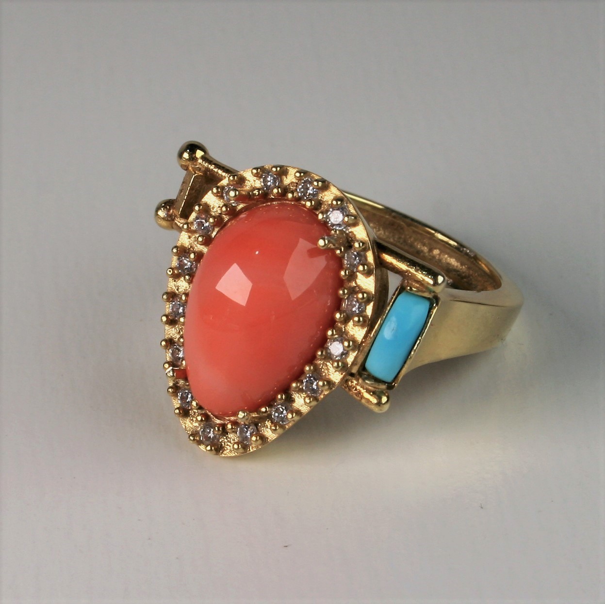 At the center is a beautiful original pink coral cabochon, set among diamonds and on the side is a arizona turquoise insert.